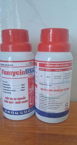 CÔNG DỤNG: Famycin USA 150SL là thuốc trừ bệnh hỗn hợp nguồn gốc sinh học, chứa kháng sinh Streptomycin, phòng trừ các loại bệnh vi khuẩn, nấm như: bạc lá, cháy bìa lá, đốm sọc vi khuẩn, lem lép hạt, héo xanh, đốm lá gốc, thối nhũn, thối hoa. Thuốc đặc trị bạc lá và cháy bìa lá lúa.
