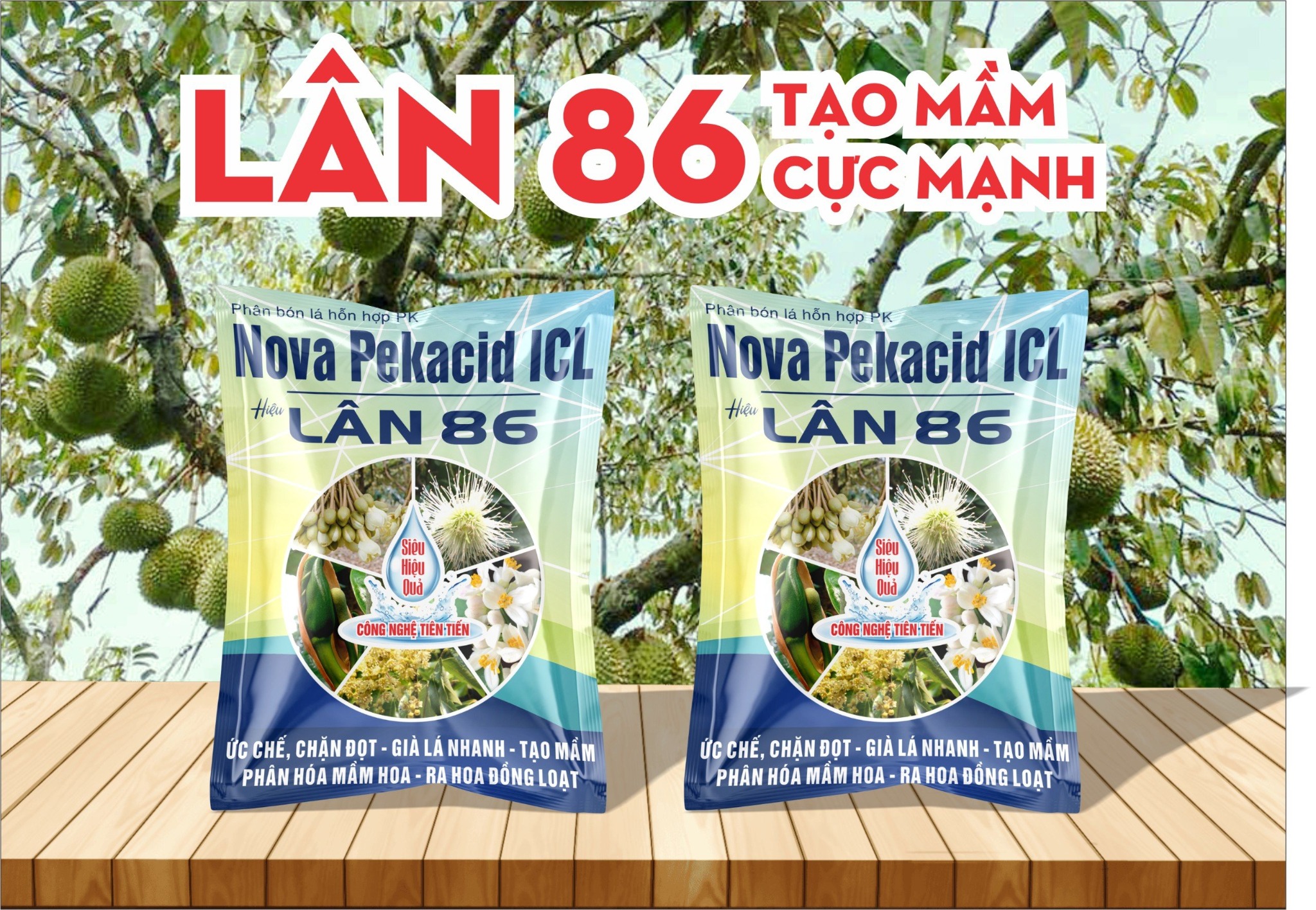 - Lân 86/ Nova Pekacid ICL chứa lân và cali cao tinh khiết với khả năng hòa tan 100% và hấp thu nhanh qua lá, từ đó cây sang giai đoạn sinh sản kích thích nhanh quá trình phân hóa tạo mầm hoa trên các loại cây ăn trái.