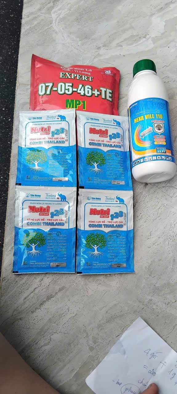 1 chai Hexavill (1lít) + 1 gói 7-5-46 (1kg) + 4 gói combi thái = pha 200 lít nước