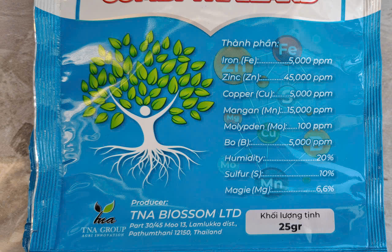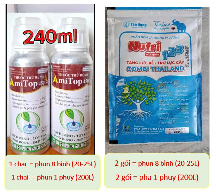 Bà con có thể kết hợp thêm 2 gói COMBI THÁI (NUTRI 123) (25gam/gói) để trái sáng đẹp, tăng độ ngọt, giảm rụng trái. Liều lượng: 2 gói COMBI THÁI (NUTRI 123)/ pha 200L nước (hoặc 1 gói = phun 4 bình máy)