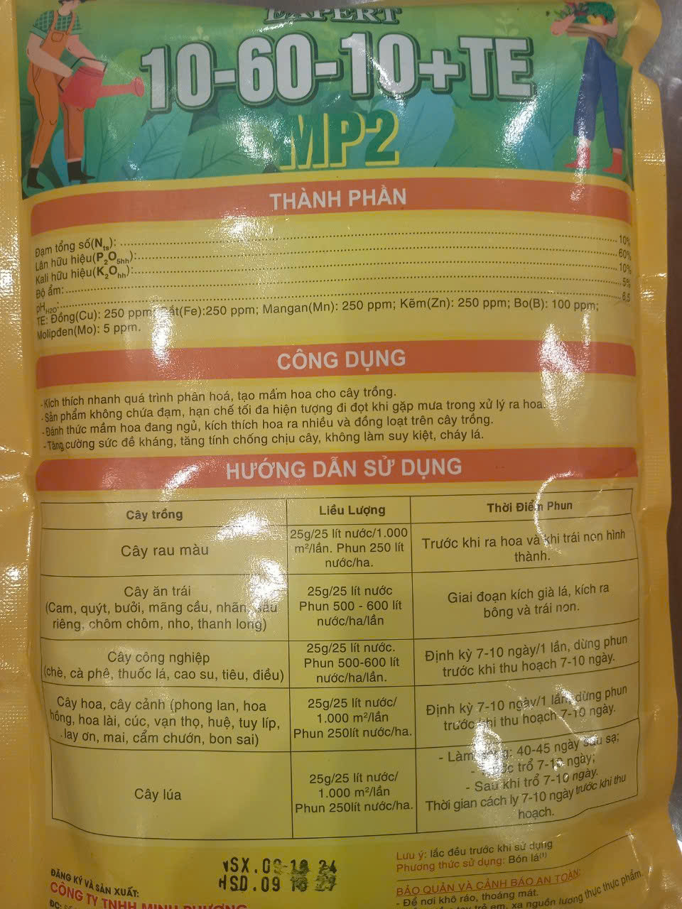 | Expert 10-60-10 (1KG) PHÂN HÓA MẦM HOA - KÍCH RA HOA - TẠO MẦM HOA - TĂNG ĐẬU QUẢ | Thành phần : Đạm tổng số (Nhh): 10% Lân hữu hiệu (P2Ohh): 60% Kali hữu hiệu (K2Ohh):10% Độ ẩm: 5% pH (H2O): 6.5 TE gồm: Đồng (Cu) 250ppm, Sắt (Fe) 25 ppm, Mangan (Mn) 250ppm, Kẽm (Zn) 250ppm, Bo (B) 100ppm | Công dụng : Kích nhanh phân hóa, tạo mầm, giúp ra hoa đồng loạt, bung hoa mạnh. Rộ hoa tăng tỉ lệ hoa cái, hoa lưỡng tính. Đánh thức mầm hoa đang ngủ - dùng xử lý ra hoa nghịch vụ và theo ý muốn. - Hàm lượng đạm thấp, hạn chế tối đa đi đọt. - không làm suy kiệt, cháy lá sầu riêng. Thời điểm sử dụng: Phun giai đoạn kích già lá, kích ra bông và trái non. | |