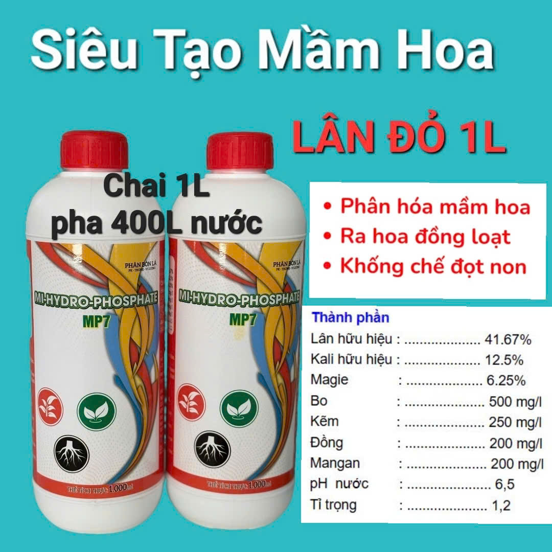 | LÂN NƯỚC 1L (LÂN ĐỎ 1l) MI-HYDRO-PHOSPHATE MP7 PHÂN HÓA MẦM HOA RA HOA ĐỒNG LOẠT KHỐNG CHẾ ĐỌT NON | Thành phần : Lân hữu hiệu : 41.67% Kali hữu hiệu : 12.5% Magie : 6.25% Bo : . 500 mg/l Kẽm :250 mg/l Đồng : 200 mg/l Mangan : 200 mg/l pH nước : 6,5 Tỉ trọng : 1,2 | Công dụng : - Cung cấp thành phần dinh dưỡng lân và kali dưới dạng phosphite hòa tan 100%. - Kích thích nhanh quá trình phân hóa, tạo mầm hoa cho cây trồng. - Sản phẩm không chứa đạm hạn chế tối đa hiện tượng đi đọt khi gặp mưa trong xử lý ra hoa . - Đánh thức mầm hoa đang ngủ, kích thích hoa ra nhiều và đồng loạt trên cây trồng . - Tăng sức đề kháng. Tăng tính chống chịu cho cây, không làm suy kiệt, cháy lá. | |