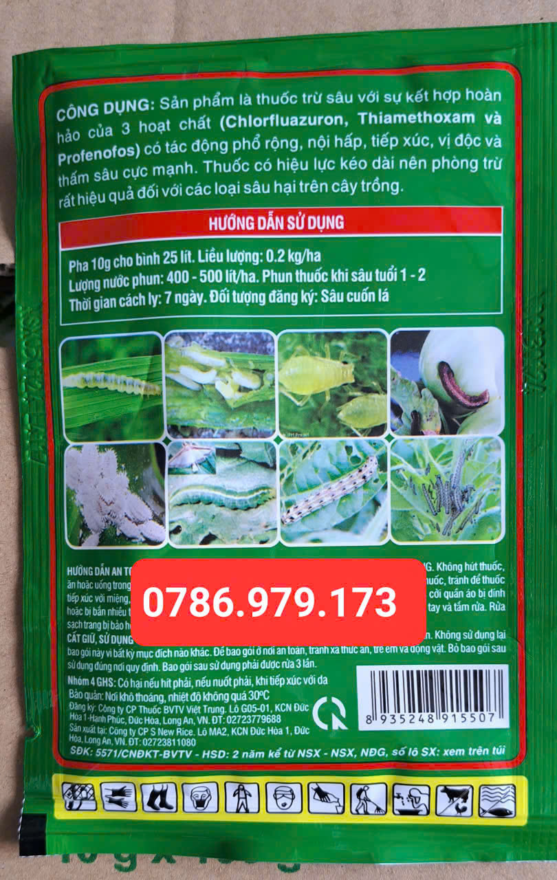 Hướng dẫn sử dụng: pha 10g (1 gói) cho bình 25 lít. Phun khi sâu tuổi 1-2.