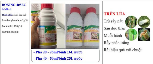 Boxing 405EC là thuốc trừ sâu kết hợp 3 hoạt chất Lamda-cyhalothrin, Profenofos và Phoxim với tác dụng tiếp xúc, vị độc, thấm sâu và xông hơi mạnh nên có phổ tác động diệt trừ rất rộng, hạ gục nhanh và hiệu lực kéo dài. Diệt trừ sạch sẽ tất cả các loại sâu rầy đã kháng thuốc.